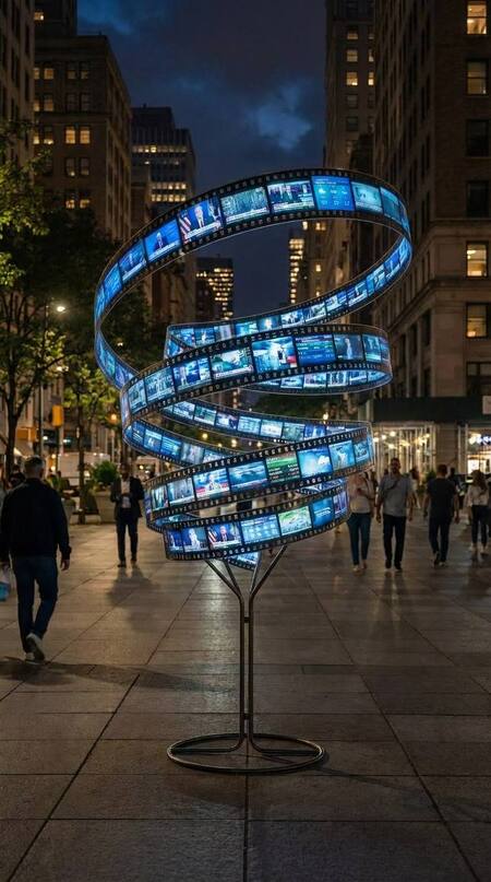 Конструкция представляет из себя длинную пленочную ленту с идущими друг за другом кадрами, на которых, изображены актуальные новостные публикации о еде, кино, шоппинге, искусстве и так далее обо всем, что пишет БГ.