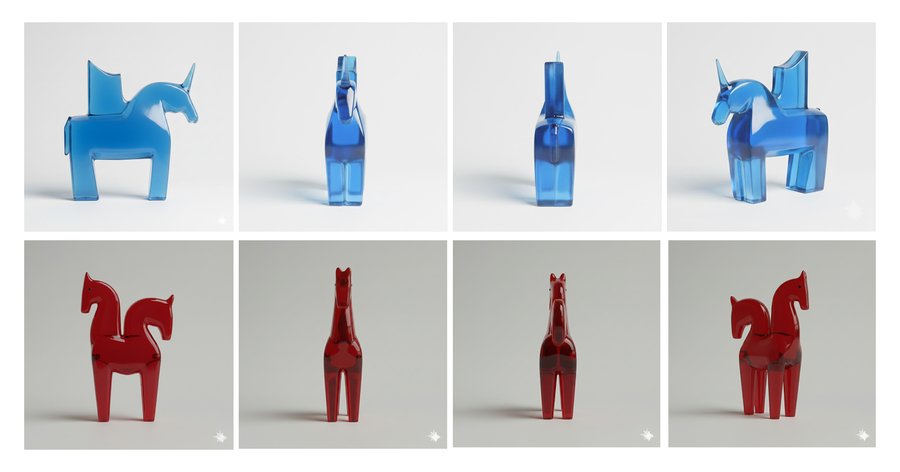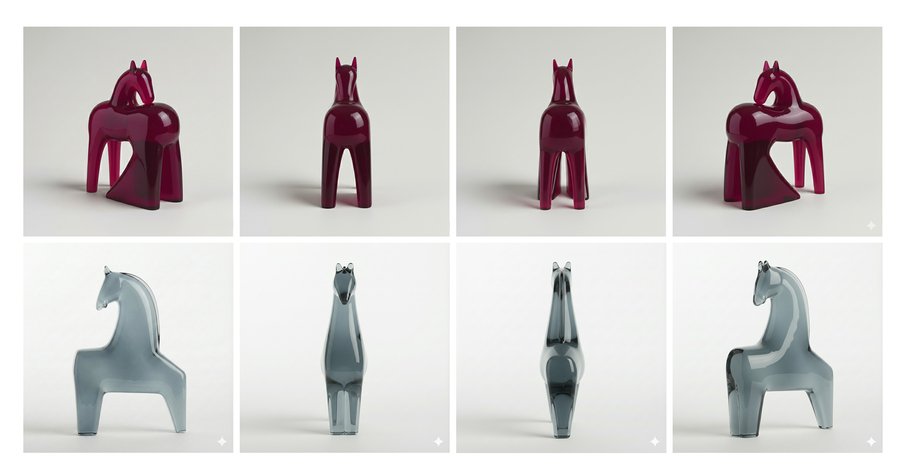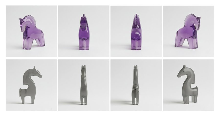 Сформулировав идею серии предметов, я сгенерировала фигурки в Krea, используя мудборд и промпт «This image features a minimalistic geometric horse set against a light gray background., krea, high resolution».