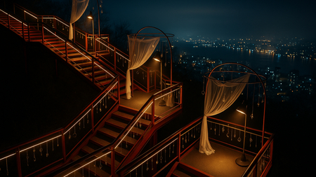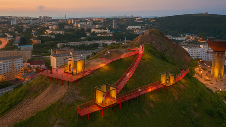 Ярко-красная лестница на сопке Бурачка, изогнутая, как буква Z. Утро, мягкий холодный свет. На каждом повороте — небольшая театральная платформа с тонкими металлическими перилами и лёгким декором: светильники, ткани, подвесы. Всё выглядит будто готовым к мини-спектаклю прямо под открытым небом.