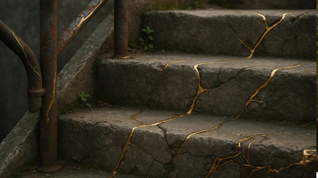 Старую лестницу не реставрируют, а подчёркивают её возраст золотыми швами кинцуги. Это археология повседневности, где трещины становятся частью красоты и памяти города.