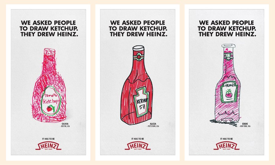 Последовательная визуальная коммуникация Heinz на протяжении многих лет сформировала у потребителей устойчивый визуальный паттерн, который стал восприниматься как прототип категории «кетчуп». Совпадение этих индивидуальных паттернов у большого числа людей привело к образованию культурного мема «кетчуп = Heinz». Рекламная кампания «Draw Ketchup» демонстрирует действие этого мема, поскольку респонденты, не получив указания на бренд, воспроизводили в рисунках именно визуальный код Heinz.