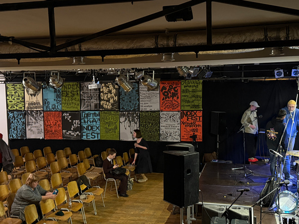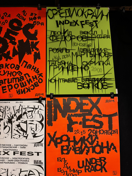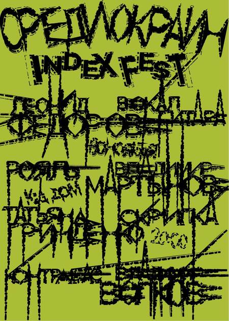 Плакат для фестиваля INDEX-FEST (концерт «Среди окраин», кц ДОМ, 26–30 ноября) представляет собой связь графики и акустики. В центре — уникальный набор знаков и гибкая структура макета. Острые, колкие формы букв, подобные звуковым иглам, являются источником визуальных колебаний. Эти исходящие от текста вибрации и их ритмичный рисунок отражают движение и тембр музыки.