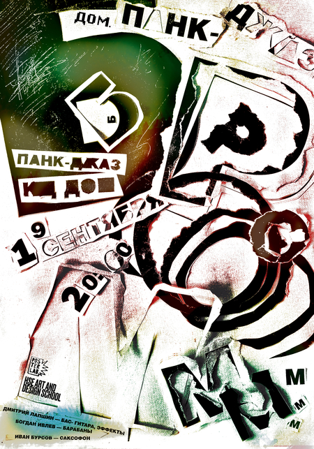 BOM punk jazz poster. In my poster, I tried to show the senses of music, her invoice. The way music makes a hole in the mind when it’s auditioned. It’s the word I interpreted through the creation of negative spaces of silhouettes of letters, rather than letters themselves, so it turned out to be ripped edges, holes, noise, and dirty street colors.