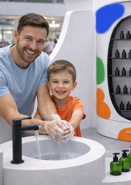 Отдельный автономный модуль, расположенный в холле торгового центра Габариты модуля: 2500×2500 мм Высота стенда: 2400 мм Подиум: 100 мм. Под подиумом проходит инженерия для отвода воды к утолщённой задней стенке, где располагаются столитровые баки с водой, чтобы обеспечить работу раковины из-за сложного расположения модуля. А также располагаются пустые баки для отвода жидкости.