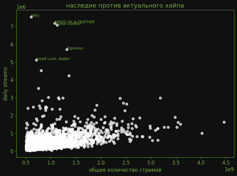 наследие против актуального хайпа — scatter plot