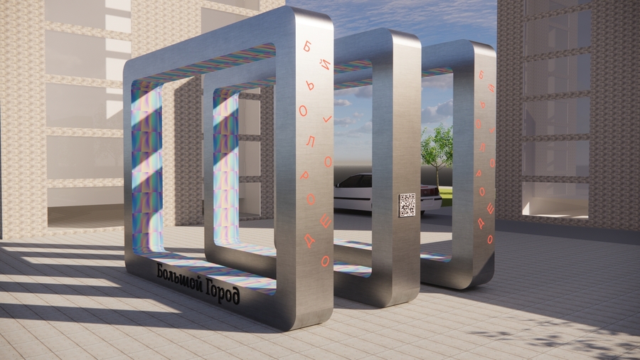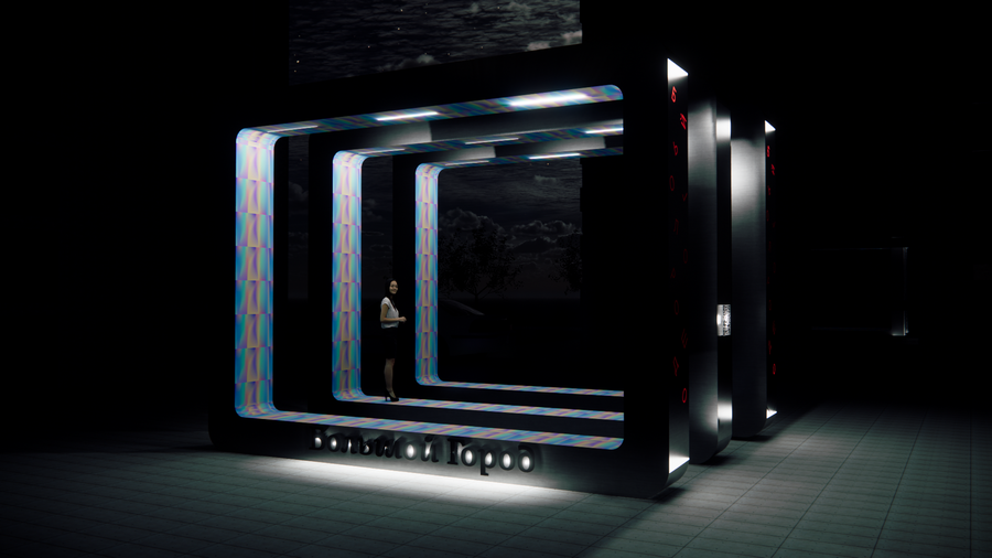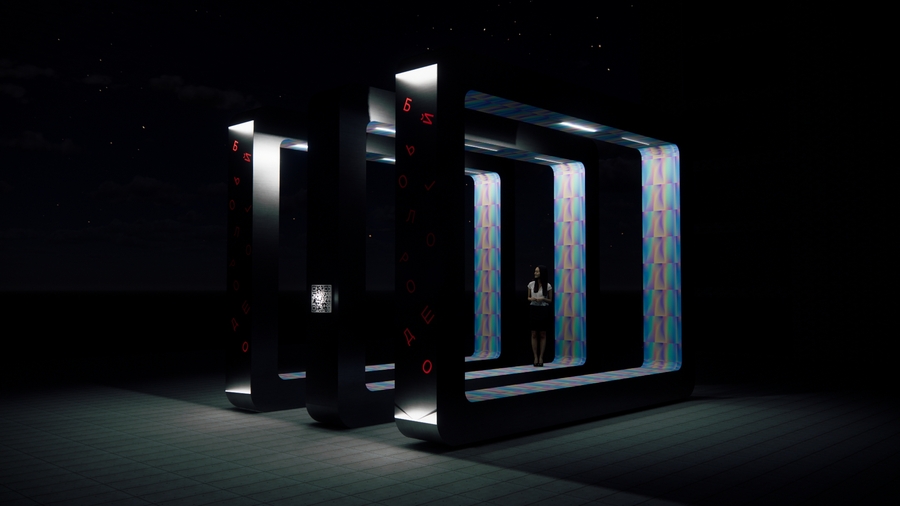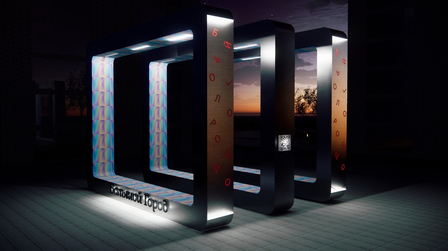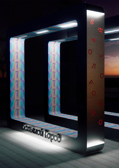 Градиентный свет символизирует движение времени и смену состояний мегаполиса — от человеческого к технологическому. Инсталляция превращается в рамку для человека и точку созерцания, соединяющую физическое городское пространство с цифровой реальностью.