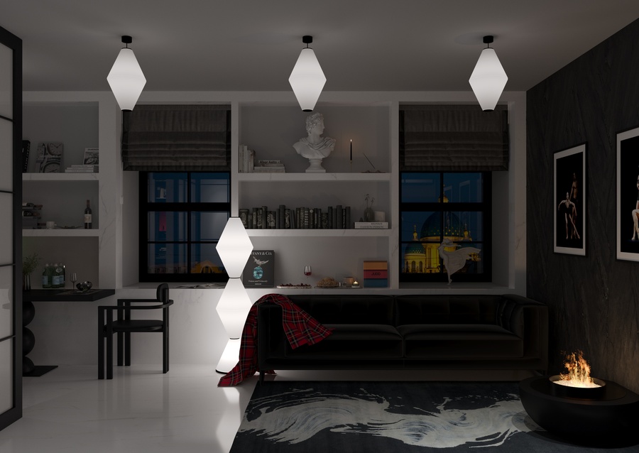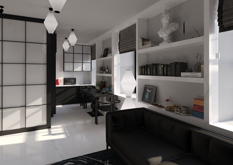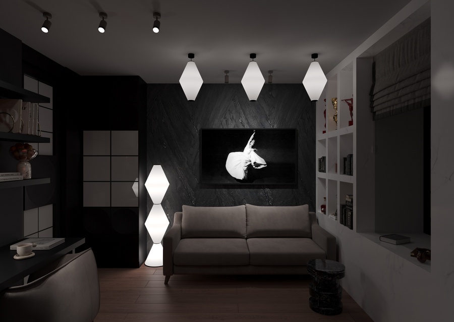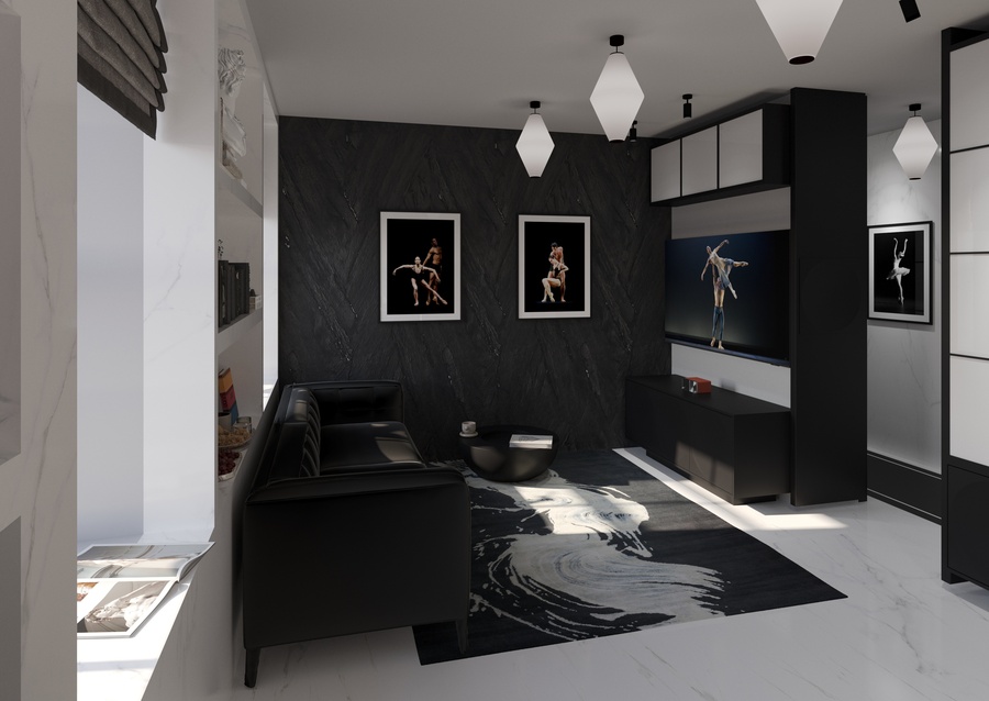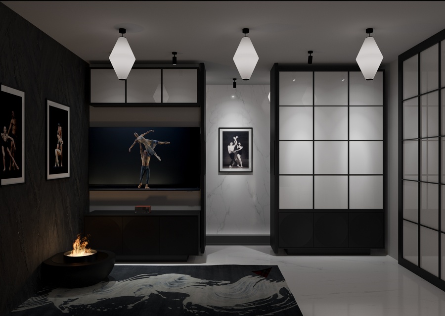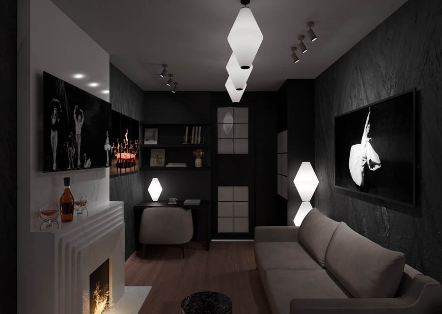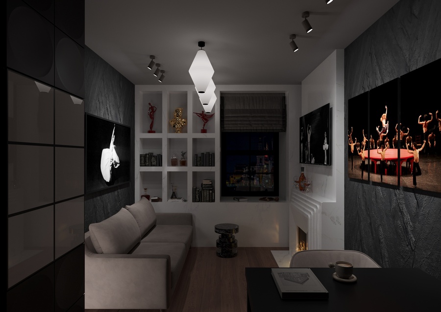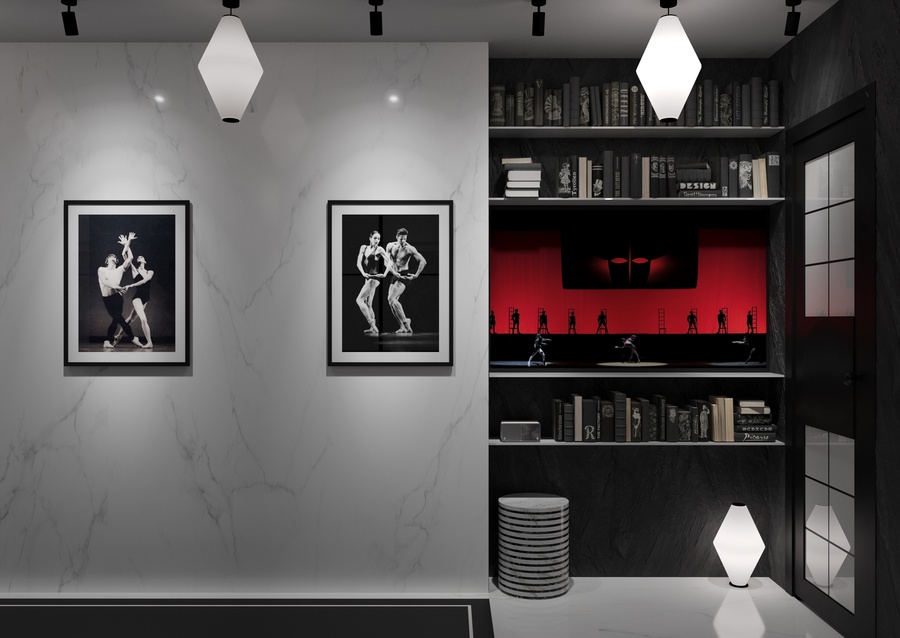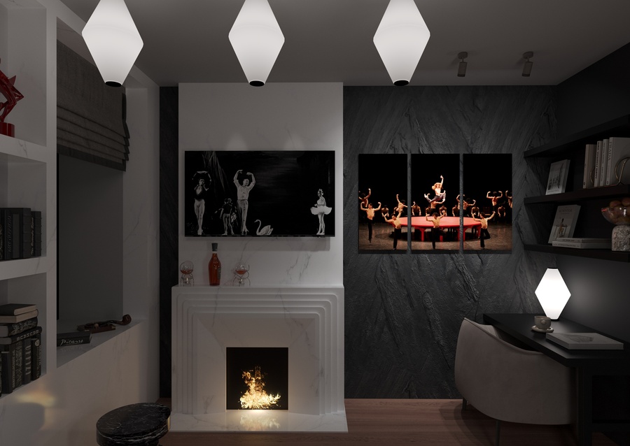 квартира в современном стиле, создающая атмосферу неоклассических и современных балетных постановок, с элементами декора, отсылающими к театральным интерьерам. Пространство, где одинаково комфортно можно посидеть с книжкой у камина или устроиться за столом с ноутбуком и углубиться в решение рабочих вопросов