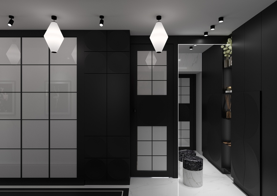преобладание монохромной контрастной цветовой палитры, сочетание керамогранита темных и светлых тонов, дубового паркета теплого оттенка, контрастных текстильных покрытий и поверхностей, окрашенных в различные оттенки серого. Яркие цветовые акценты присутствуют в основном в декоре