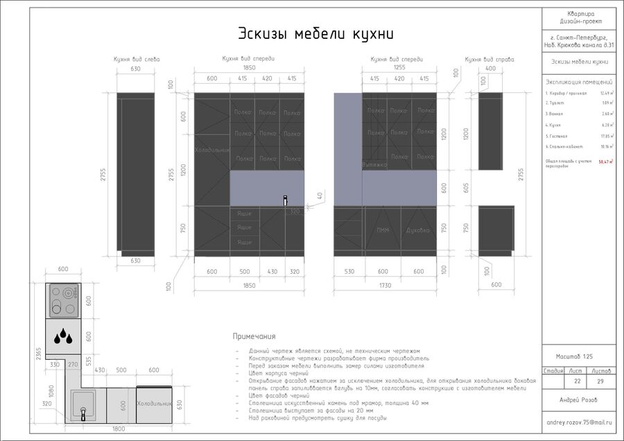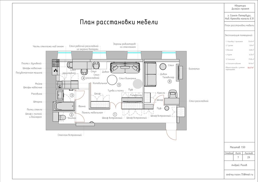 гостиная, полноценная кухня, спальня-кабинет, туалет, ванная, коридор, где можно разместить картины или постеры, два рабочих места, четыре спальных места, био-камин, места хранения для книг, предметов коллекционирования, одежды и инвентаря