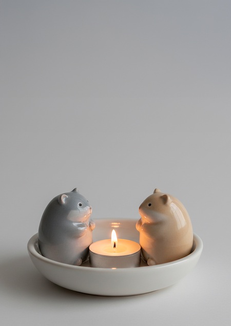 A single ceramic candle holder scene with TWO hamsters sitting opposite each other inside ONE shared shallow round bowl. There is ONE tea light candle placed exactly in the center between them.