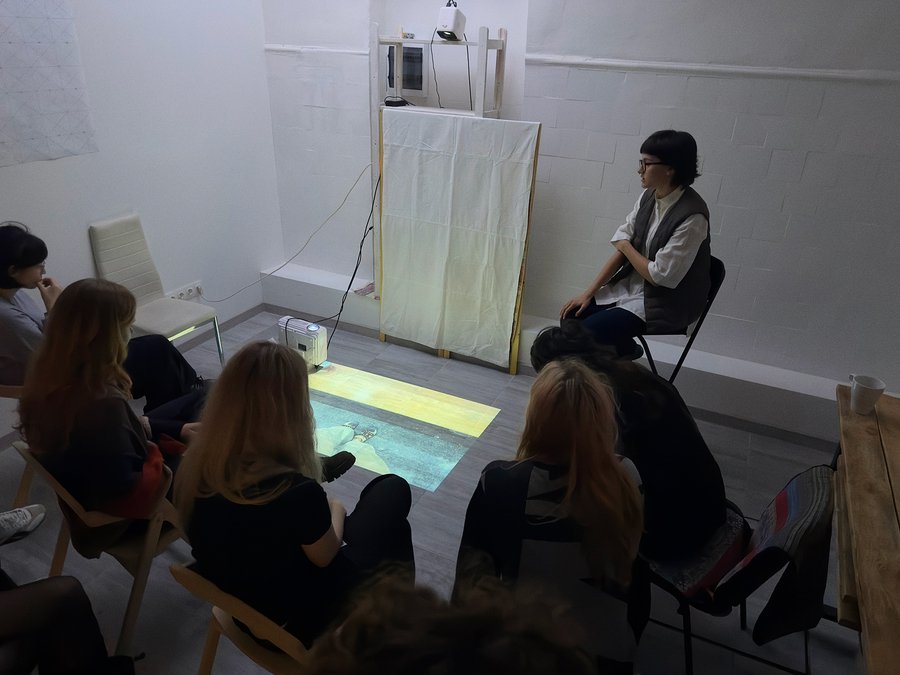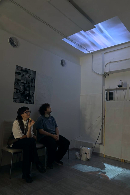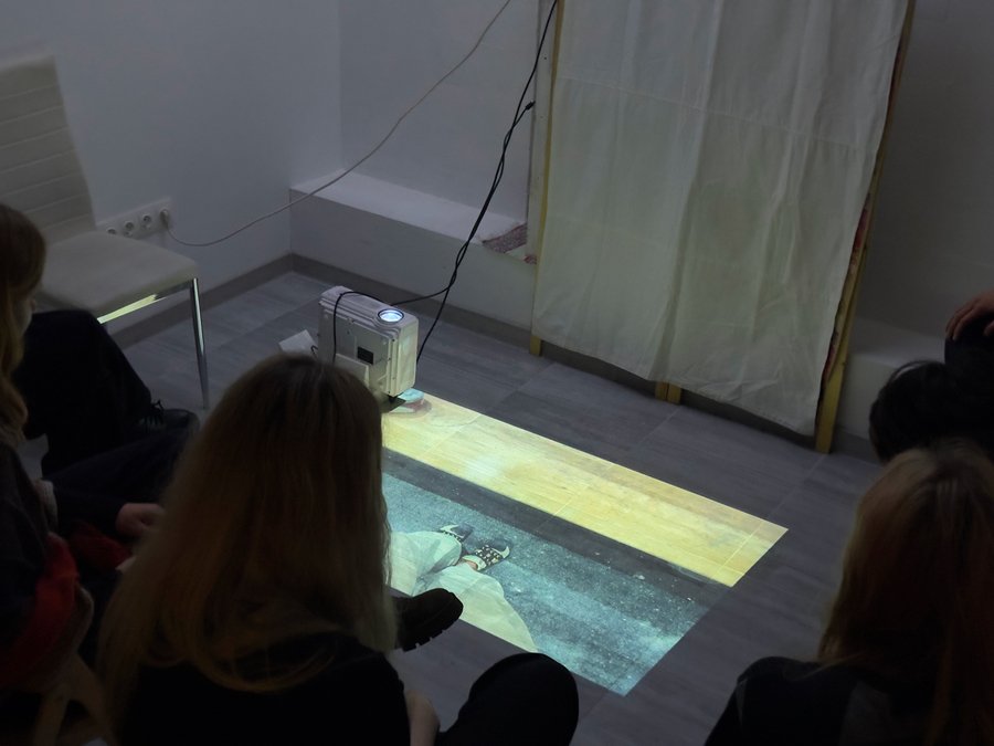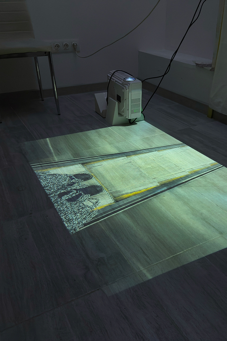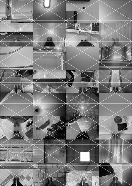 Посетители могут встать на проецируемые изображения и повторить мой ракурс. Подняв взгляд, они увидят потолок с моей перспективы. Выствка приглашает посетителя к соучастию, действие «взгляд вниз, взгляд вверх» — ключевое для ритма серии.