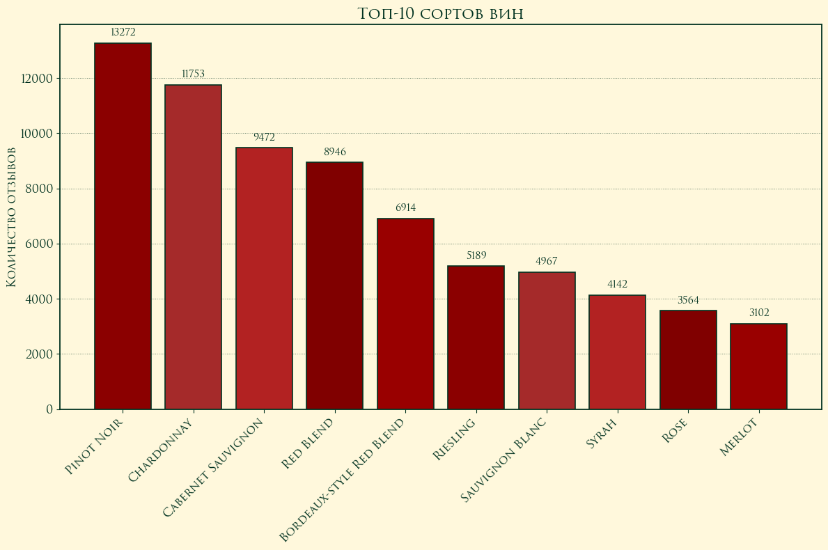 Наибольшее количество отзывов приходится на классические сорта, такие как Pinot Noir и Chardonnay, что отражает их популярность и широкое распространение в мире.