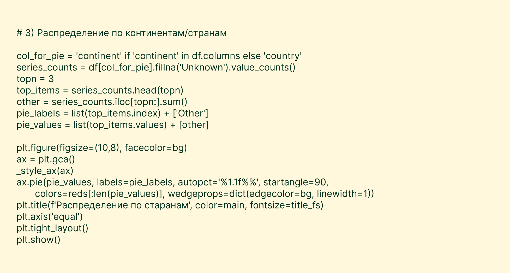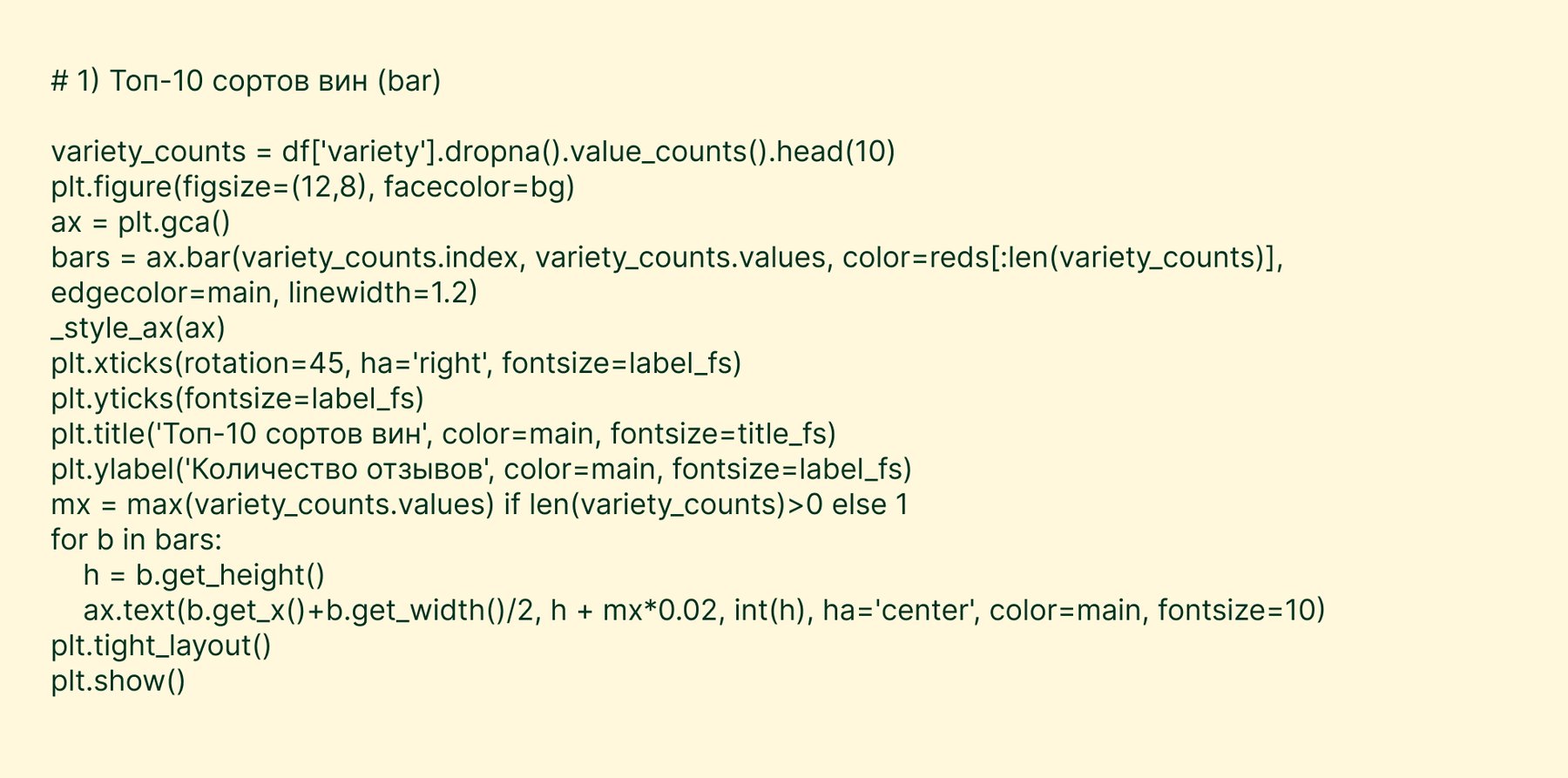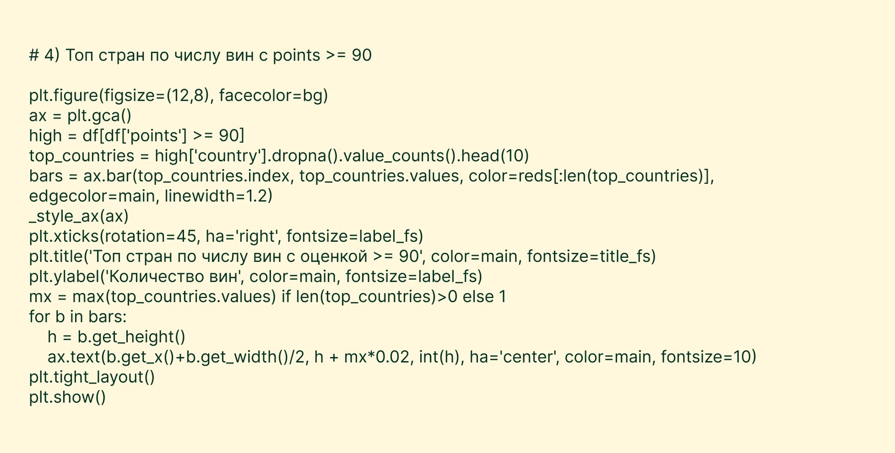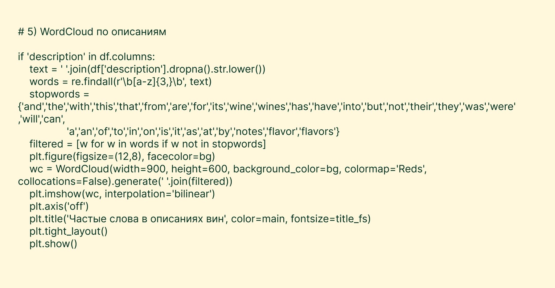Датасет был загружен и преобразован для анализа. А также была проведена очистка и подготовка данных: — приведены к числовому формату поля «points» и «price», — удалены или обработаны пропущенные значения, — выделены основные страны и регионы производства. Для визуализации использовались библиотеки Matplotlib и WordCloud