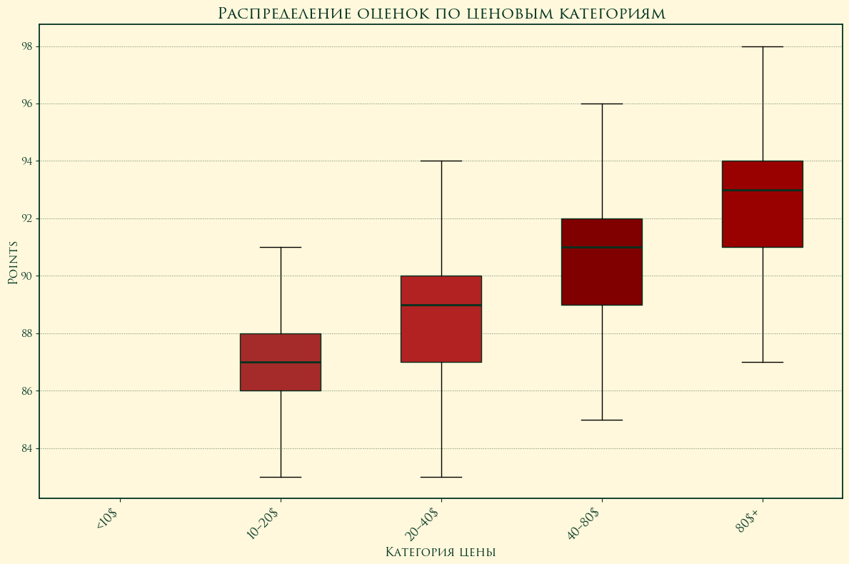 Зависимость цены от оценки Наблюдается умеренная положительная корреляция: чем выше оценка, тем, как правило, выше цена. Однако есть и исключения — вина с высокими оценками по доступной цене.