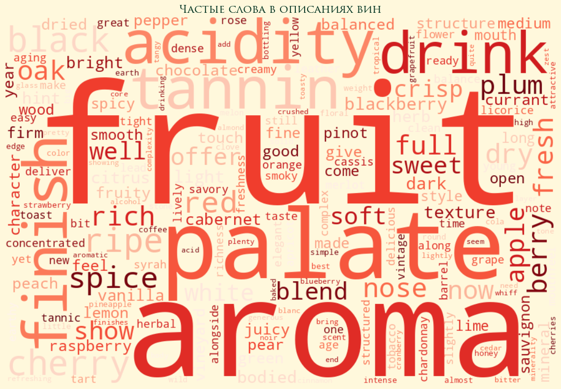 Облако слов по описаниям Чаще всего в описаниях встречаются слова, связанные с вкусовыми и ароматическими профилями: fruity, dry, rich, soft, smooth