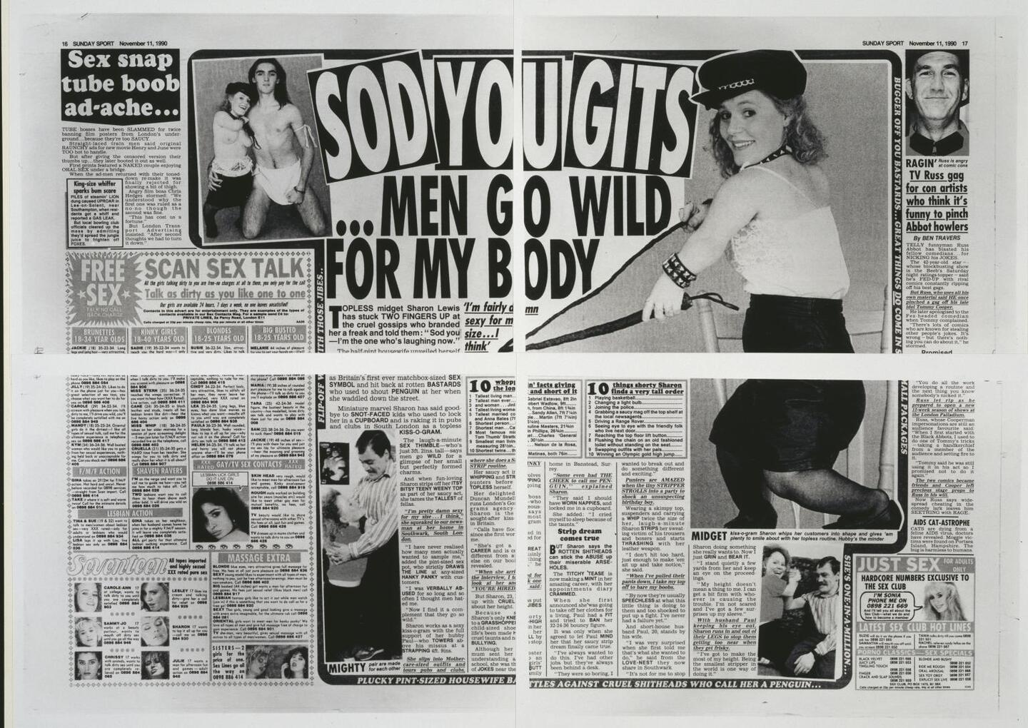 «Дерьмо, вы мерзавцы», «Семь вверх» Сары Лукас — работы из серии увеличенных газетных разворотов, названия которых взяты из заголовков. Бульварная пресса — это непосредственный источник образов массовой культуры. Лукас здесь работает как зеркало, указывая пальцем на всепроникающие паттерны отношения к женщине как к сексуальному объекту. Она разоблачает и высмеивает мужское женоненавистничество. На разворотах присутствуют второстепенные статьи о преступных действиях мужчин, которые еще больше подрывают их голос. К созданию этих работ ее подтолкнуло наблюдение за собственной противоречивой реакцией. С одной стороны она идентифицировала себя как зрителя с традиционно мужским желанием, и как женщину, которая объективируется и дегуманизируется через свою культурную репрезентацию.