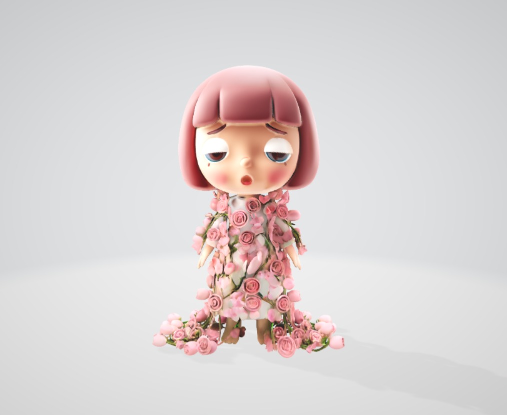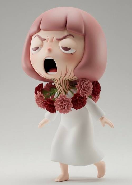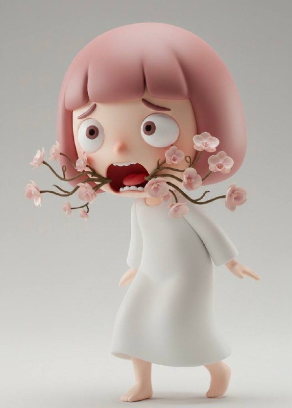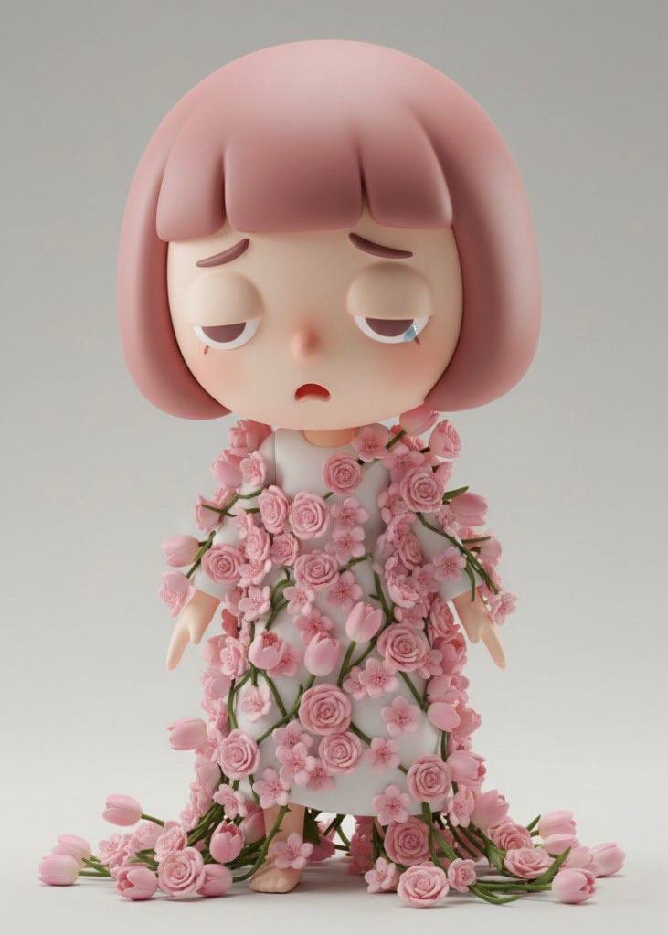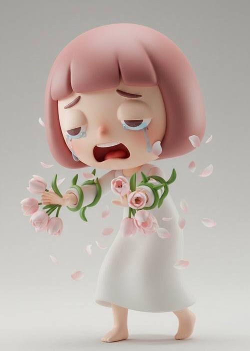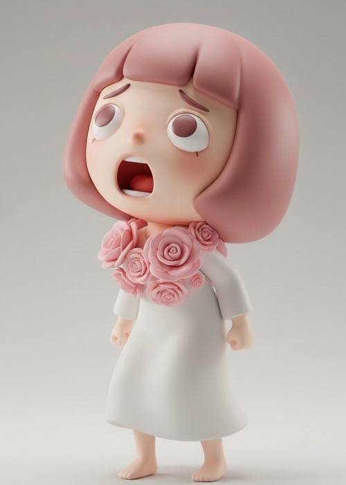 «Art-house PopMart style collectible figure, the same melancholic stylized girl character, oversized head and simplified body proportions, sculptural and non-cute design, half-closed heavy eyelids, expressive animated facial features, pale skin with subtle blush, short blunt bob haircut, simple white knee-length nightgown dress, barefoot, smooth vinyl or resin toy surface, clean readable shapes suitable for 3D printing, muted pastel color palette, dramatic animated pose, neutral background, studio lighting»