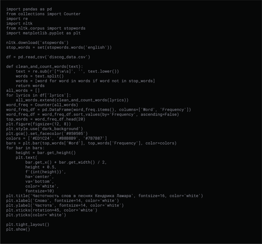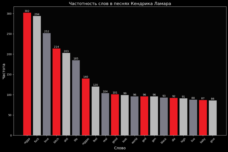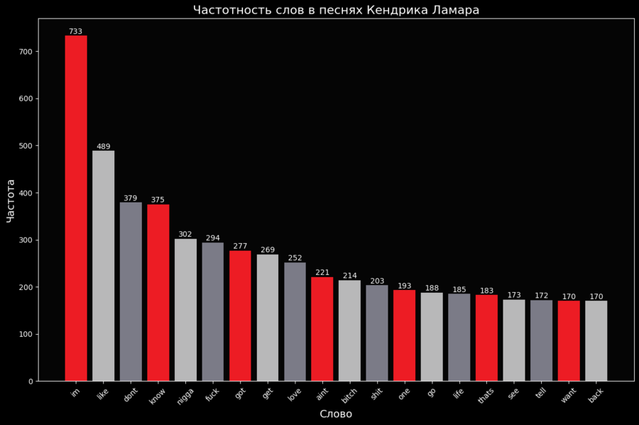 График частотности слов в песнях Кендрика Ламара // Тот же график, но с более конкретной фильтрацией слов.