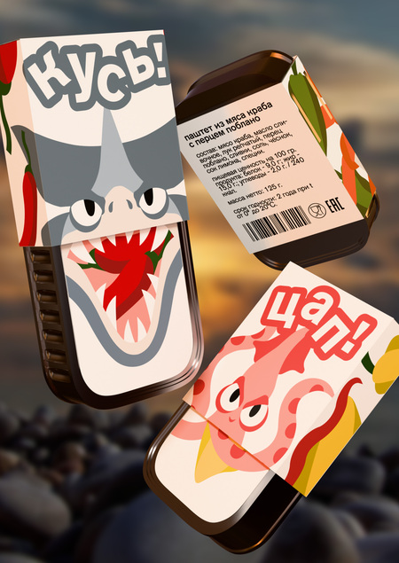 в основу дизайна упаковки легла метафора остроты — морские существа держут перцы разных сортов и игриво приглашают попробовать содержимое.