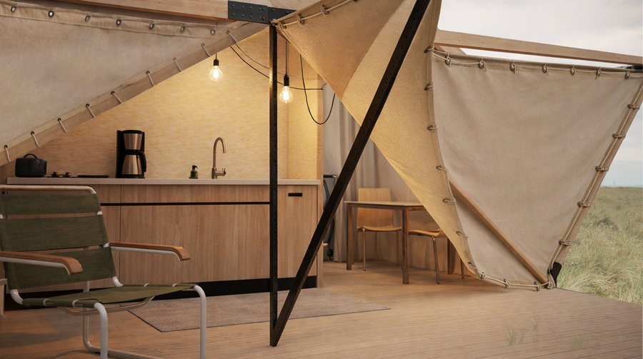 Планировка спроектирована таким образом, чтобы домих был двувидовым с доступом дневного освещения в обе функциональные зоны. Внутри дом разделен на две части по принципу палатки.