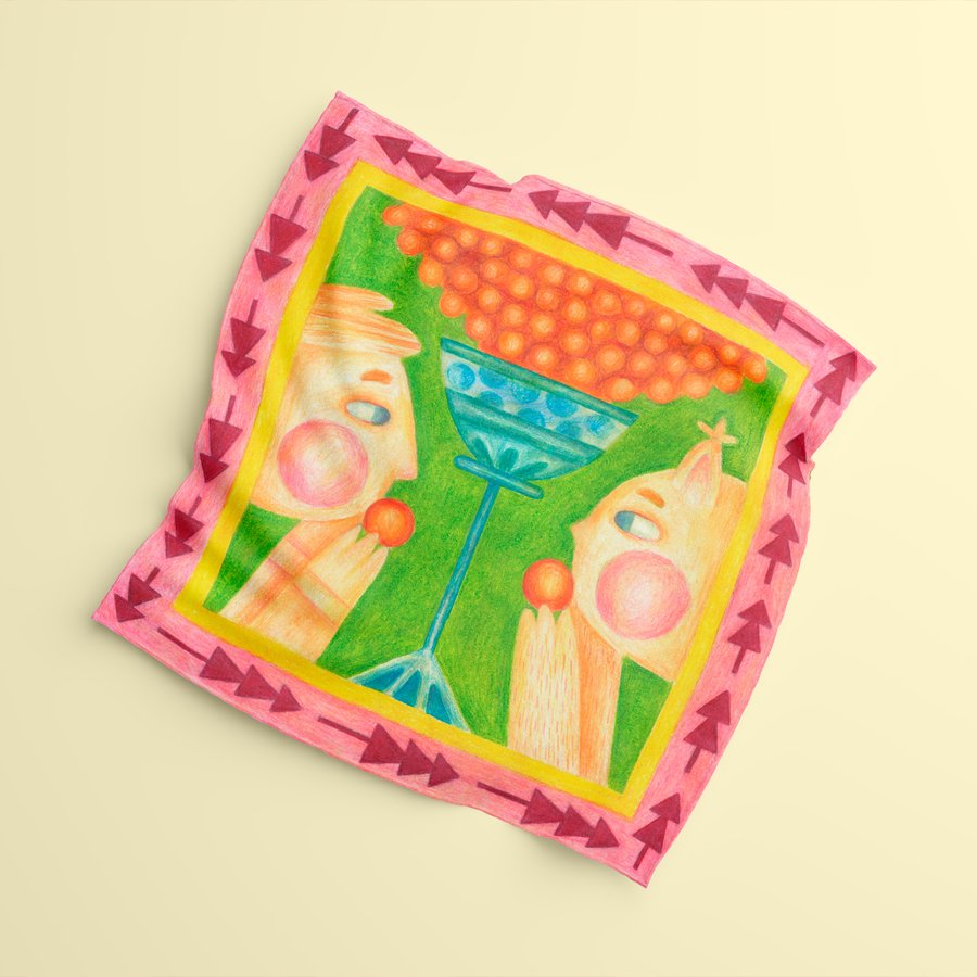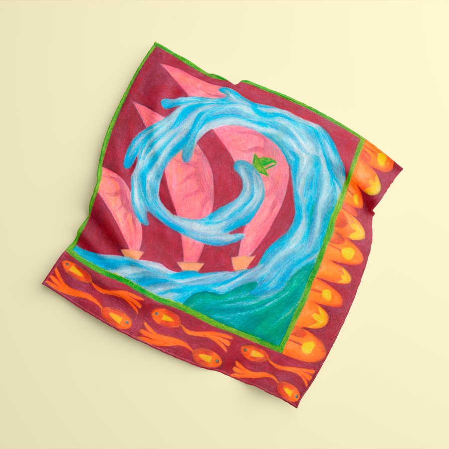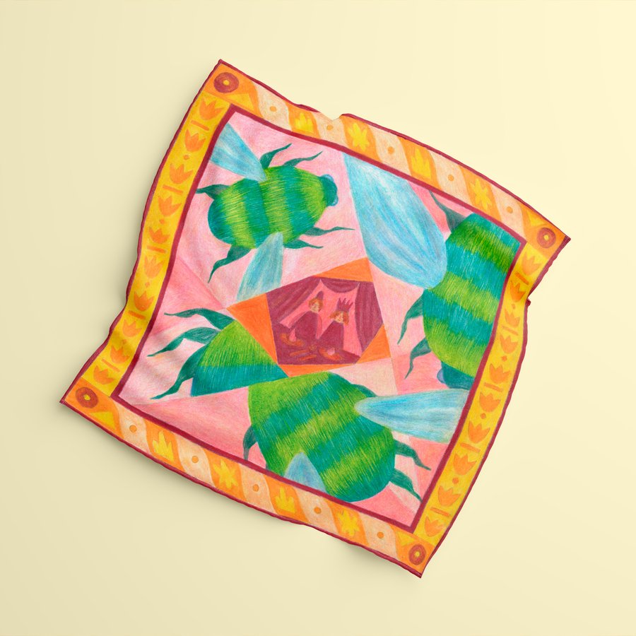 Платочная серия построена на переосмыслении сюжетов из «Сказки о царе Салтане» и адаптации их под орнаментальный формат. Мне хотелось сделать серию яркой и забавной. Поэтому для моих платков я выбрала сюжеты с белкой, шмелями и кораблями.