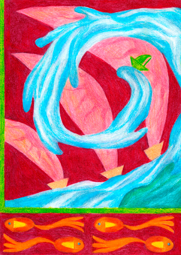 Работы выполнены цветными карандашами. Накладываясь друг на друга, они создают интересные сочетания, а также, где нужно, позволяют легко придать объём.