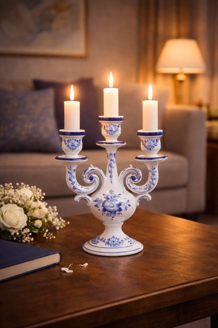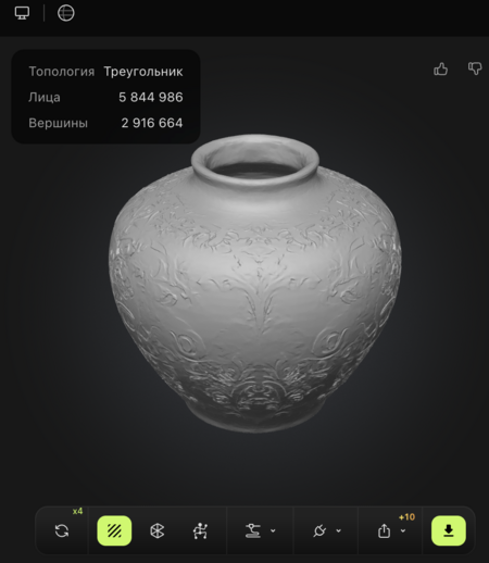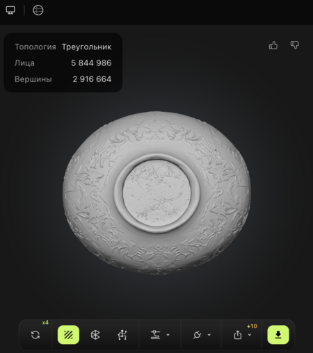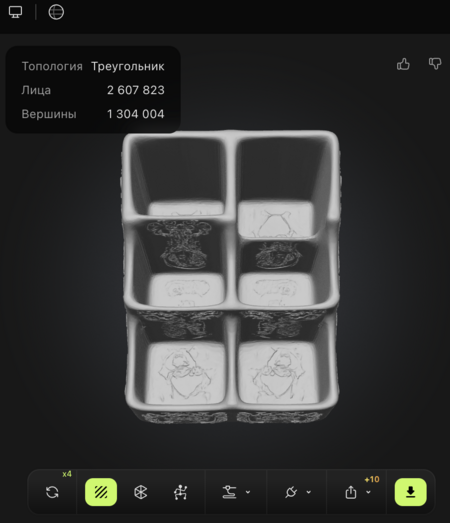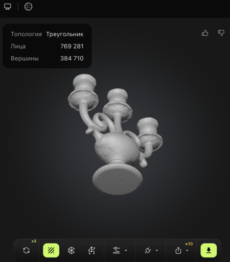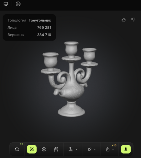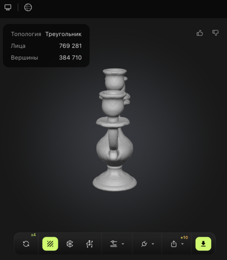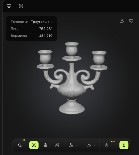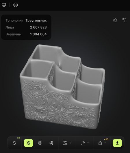 Генерация визуализаций и исходных 3D-моделей в Meshy В сервисе Meshy были сгенерированы промо-изображения предметов серии в единой стилистике гжели (белая основа, кобальтово-синяя роспись, цветочные и растительные мотивы). На основе сгенерированных изображений в Meshy были получены исходные 3D-модели объектов серии (подсвечник, органайзер, ваза). После генерации модели были экспортированы в формате STL для дальнейшей проверки и подготовки к 3D-печати.