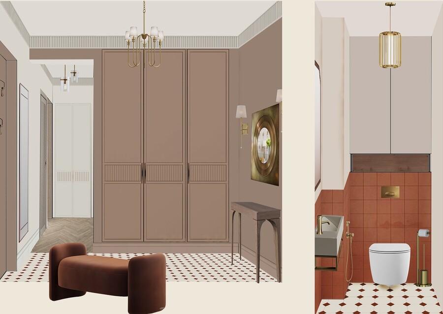 Прихожая — первое, что видит человек, попадая в квартиру, и задает общее настроение интерьеру. Поэтому было принято решение сделать ее яркой, но в то же время сдержанной и лаконичной.