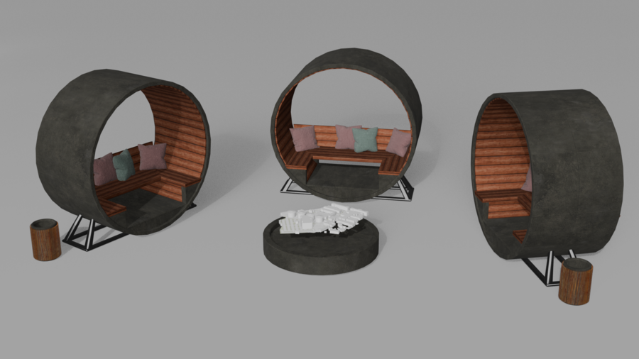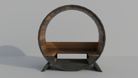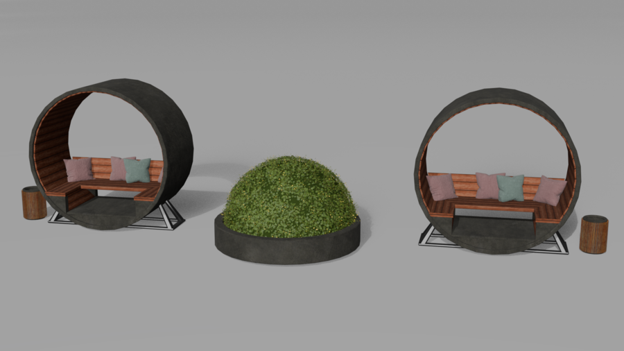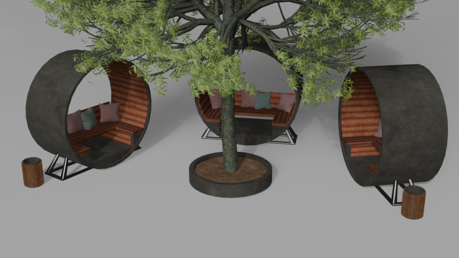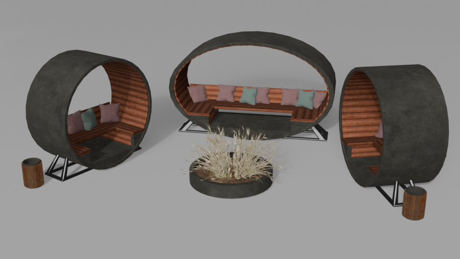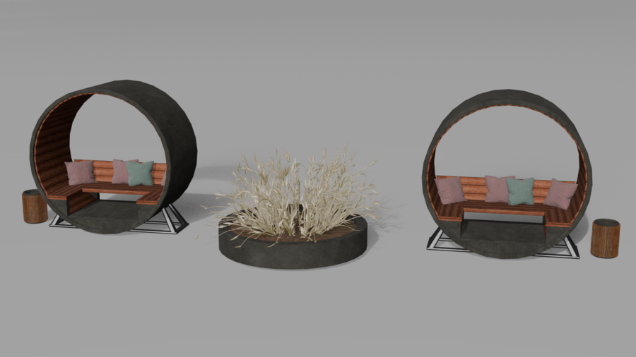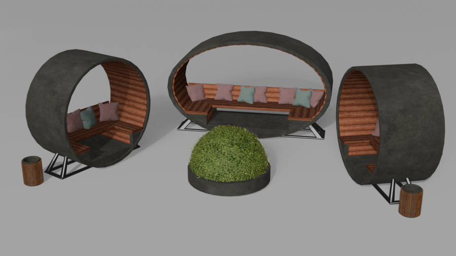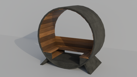 В итоге я реализовала идею скамейки в цилиндрической форме, которая поддерживает округлые формы газгольдеров.