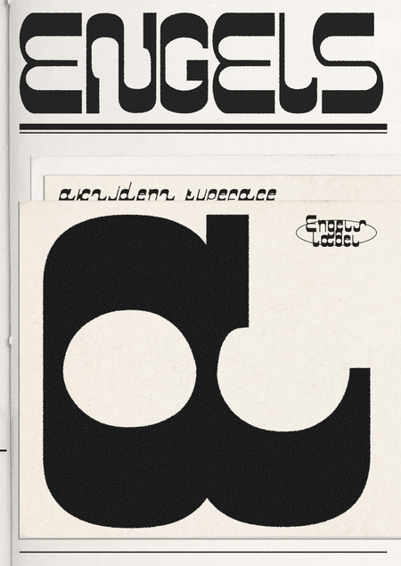 ENGELS — модульный шрифт, вдохновленный советскими акциденциями с обратным контрастом. Пластика шрифта собрана из модулей-примитивов: прямоугольника и ¼ окружности.