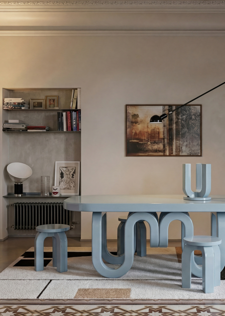 В состав коллекции входят: обеденный стол и табуретка; проект объединяет графические формы авторского акцидентного шрифта «ini font» и функциональные объекты, превращая абстрактные формы в практичные элементы интерьера