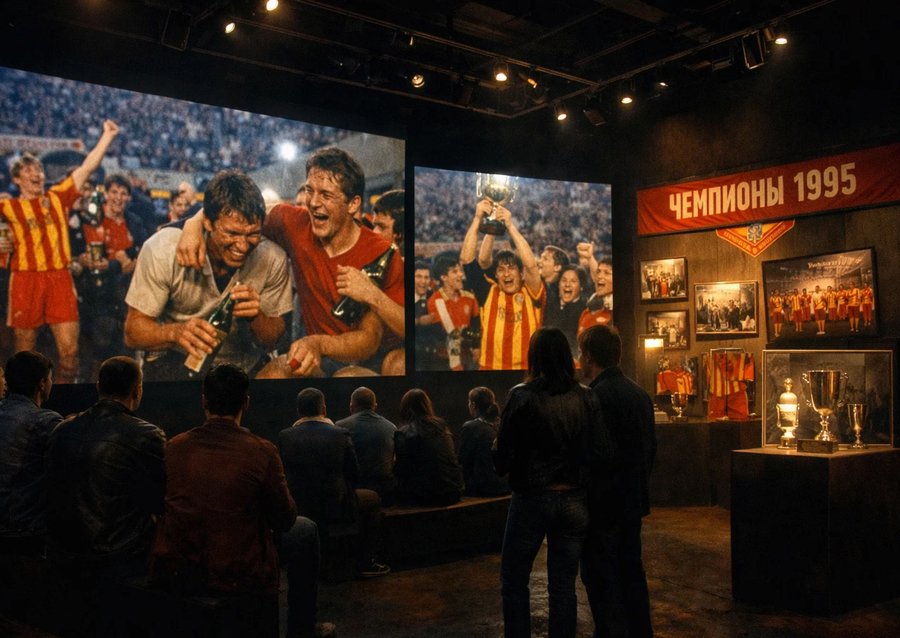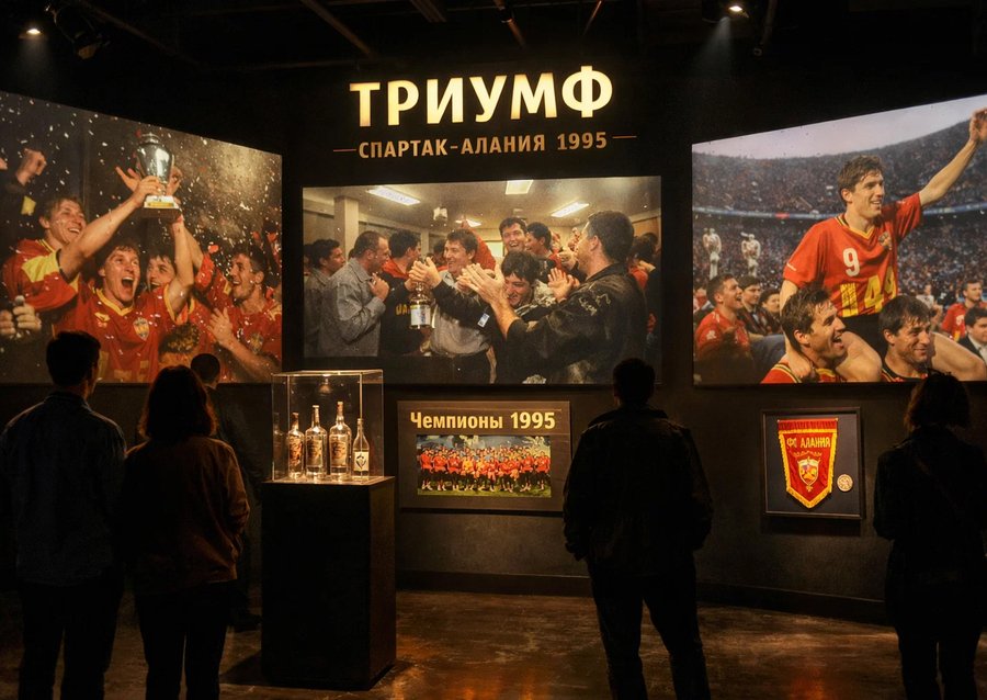 Затемненное пространство. На больших экранах — архивные кадры победы «Спартака-Алании» в 1995 году, ликующие лица, празднование в раздевалке. Звучат тосты, музыка того времени