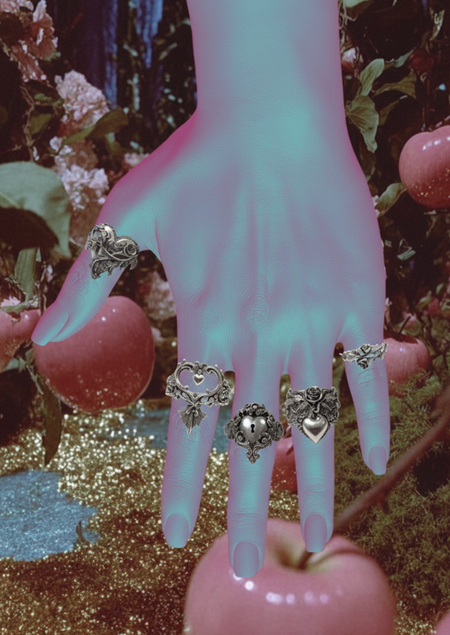 Промт: a photo of a rainbow-pink hand with five silver rings on each finger. in the background is a surreal landscape with huge apples and shiny green leaves. in the style of Tim Walker’s fairy-tale photography, with soft lighting that casts gentle shadows, creating a magical atmosphere. photographer Petra Collins used a pastel color palette and a soft-focus lens.