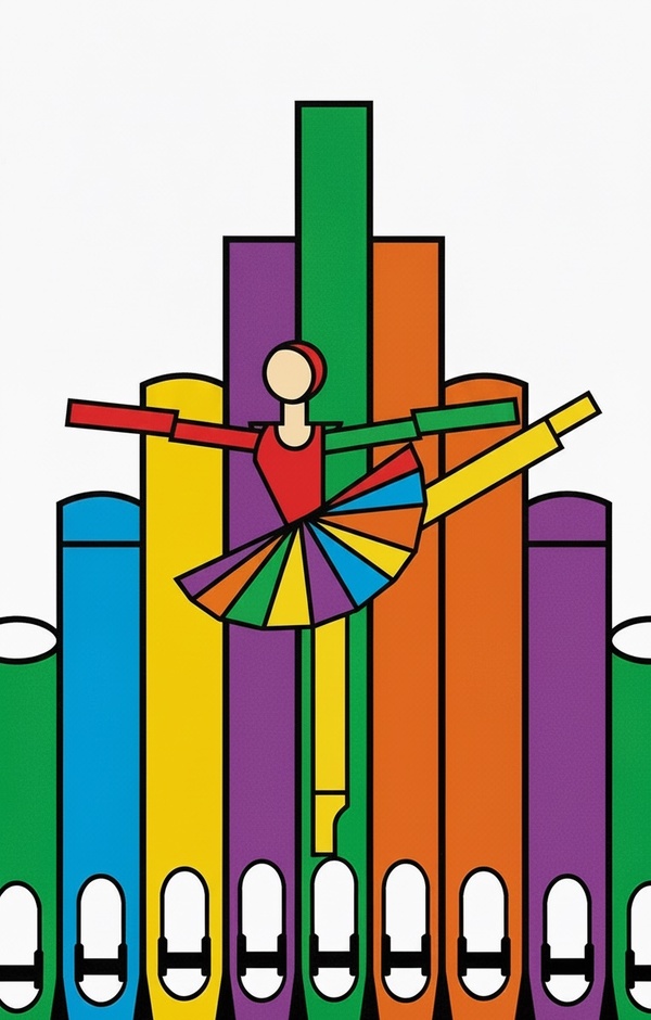 I. Партитура делит часовое выступление на три концептуальных блока. В каждом из них Орган и Драм-машина вступают в диалог, исследуя полярные музыкальные жанры — от сакральной акустики до жесткого электронного ритма. Это столкновение эпох и технологий создает уникальное звуковое полотно. II. Визуальная часть партитуры координирует энергию зала: Линия сверху (Танцор): Задает импульс. Это визуальный метроном и источник вдохновения, транслирующий настроение музыки и направляющий пластику остальных участников. Линия снизу (Люди): Отражает процесс погружения. Зрители подхватывают музыкальную волну, проходят путь от наблюдения к соучастию и в финале полностью растворяются в звуке и ритме. III. Партитура задает жесткий каркас, внутри которого рождается магия случайности: Точки опоры: Тональность, темп, жанр и тайминг зафиксированы строго. Это фундамент. Пространство свободы: Всё остальное — мелодические рисунки, конкретные па и эмоциональные оттенки — отдано на откуп воображению исполнителей здесь и сейчас. IV. Цвет и графика — это язык, на котором партитура «говорит» с артистами. Хроматические акценты и символы служат навигационными маяками (полная легенда и расшифровка графических обозначений вынесены на оборотную сторону листа).
