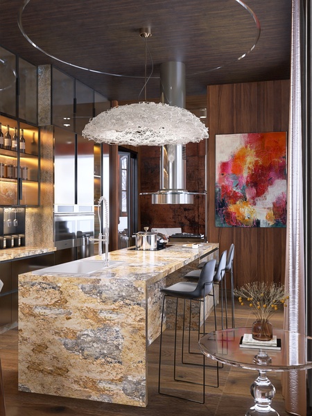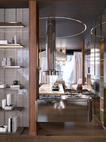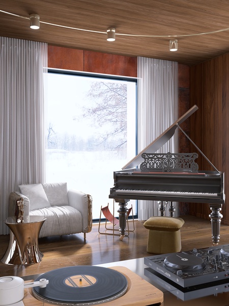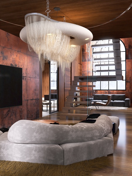 Дом строится на дерзких сочетаниях: холодный металл рядом с тёплой фактурой, тяжёлые объёмы рядом с мягкими, почти «животными» поверхностями.