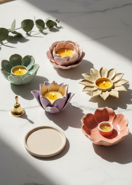 Визуальная генерация первичных образов выполнена в Yandex Alice. Для каждого подсвечника были сгенерированы отдельные изображения с фокусом на детализации текстуры, форме лепестков и конструкции центрального элемента.