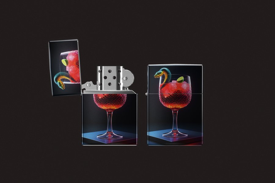 - Объект представляет собой бокал на ножке с детализированной текстурой, наполненный имитацией коктейля с кубиками льда, долькой лайма и змейкой, выглядывающей из бокала. - Объект подлежит комплексной печати с высокой детализацией мелких элементов (змея, структура льда, текстура бокала).