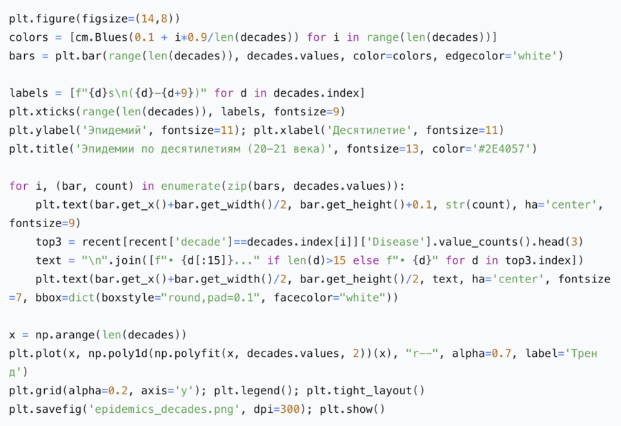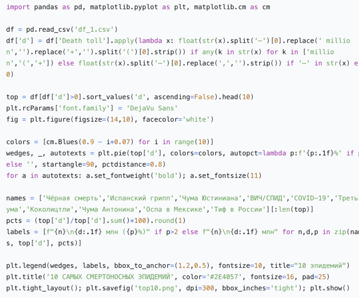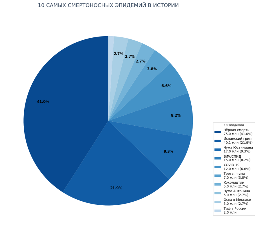 В заключение хочу поделиться своим анализом. Исходя из всего вышесказанного, можно сделать вывод о болезнях-рекордсменах, которые веками мучают человечество. Также я добавила данные о современных заболеваниях (COVID-19, ВИЧ/СПИД) для наглядной иллюстрации того, как развитие медицины и изменения в обществе повлияли на смертность от различных болезней.