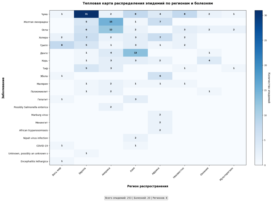 Карта вспышек заболеваний наглядно демонстрирует хронологию и географию распространения эпидемий по всему миру. Карта не просто фиксирует точки вспышек — она визуализирует историю человечества через призму его уязвимости и борьбы с инфекционными угрозами, показывая, как глобализация и технический прогресс меняли правила распространения болезней.