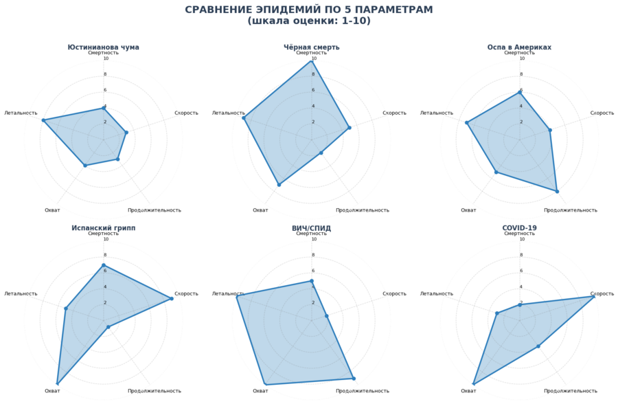 Для этого сравнения я выбрала четыре исторические болезни, распространённые в эпоху, которая характеризовалась примитивной медициной, постоянными войнами и полной антисанитарией. Именно эти факторы объясняют столь высокую смертность в прошлом по сравнению с нашим временем. В то же время нельзя не отметить возросшие скорость распространения и охват современных заболеваний, что связано с увеличением численности населения и интенсивными мировыми перемещениями.