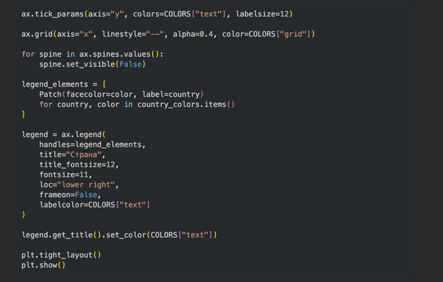Сравнительный анализ территориальных объектов — реализован с помощью горизонтальной столбчатой диаграммы с цветовой кодировкой по странам. Это позволило одновременно сравнить города по количеству станций и визуально выделить страновую принадлежность метросистем.