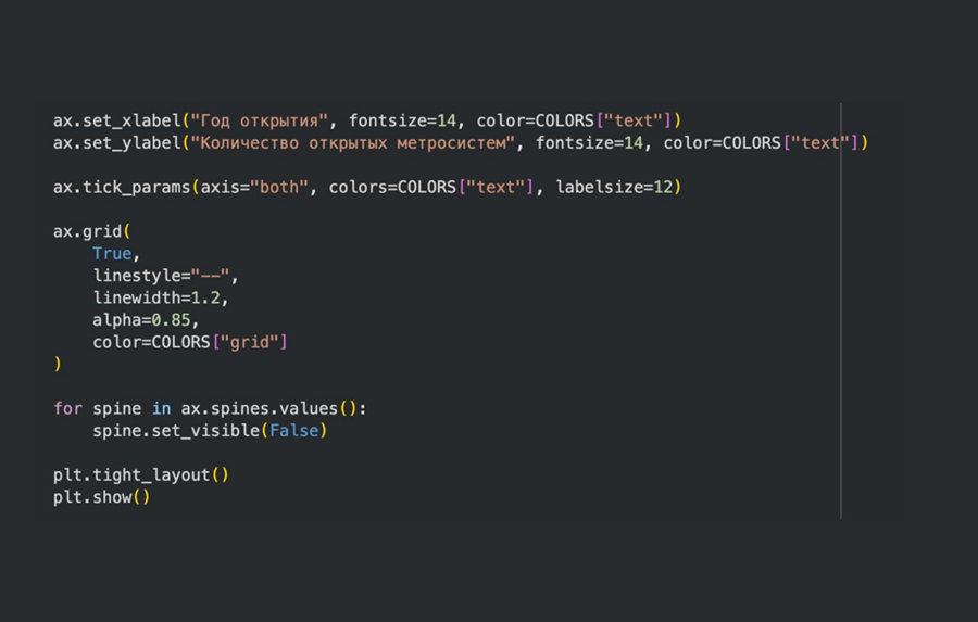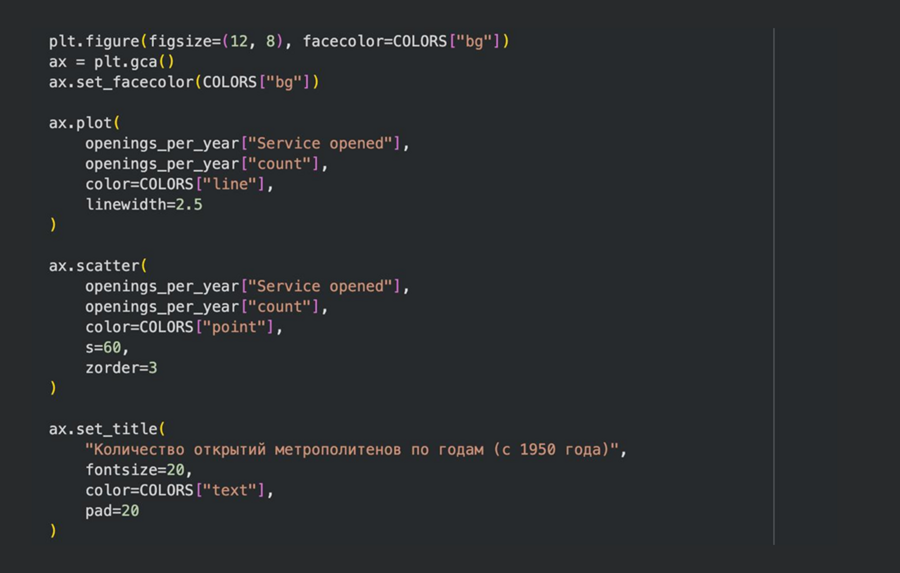 Анализ временных паттернов — использовался для изучения динамики открытия метросистем по годам начиная с 1950 года. Линейный график с точечными значениями позволил выявить периоды активного развития метрополитенов.