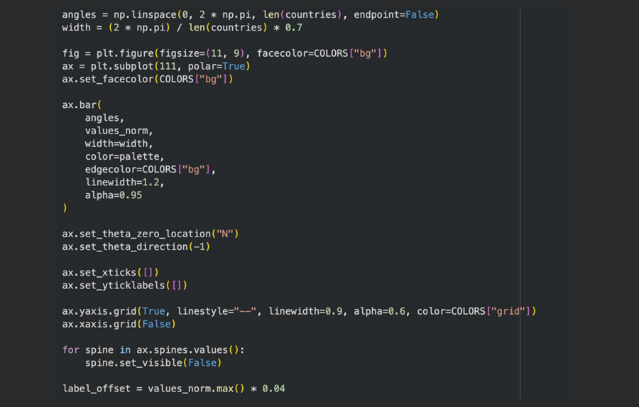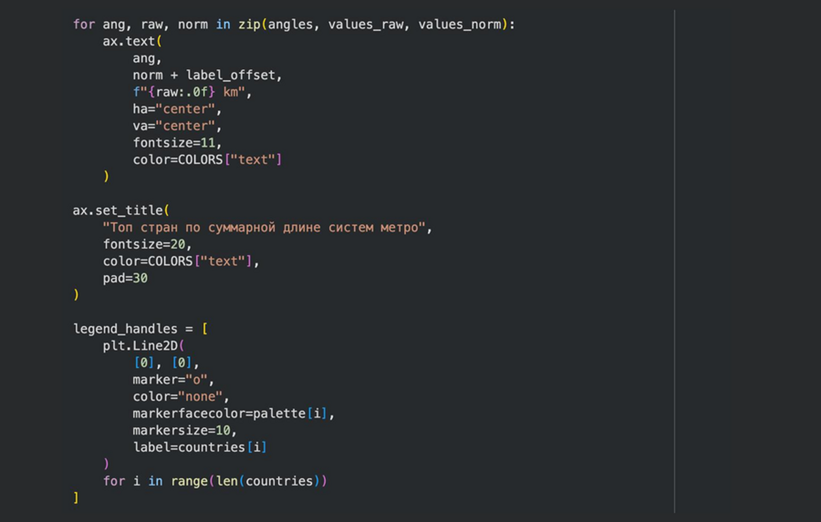 Многомерная визуализация и ранговый анализ — выполнены с помощью радиальной столбчатой диаграммы (polar bar chart), что позволило наглядно представить относительные различия между странами по суммарной длине метросетей.