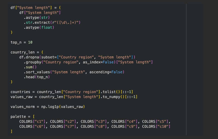 Агрегирование и страновой анализ — реализован при суммировании общей длины метросистем по странам. Это позволило перейти от анализа отдельных городов к оценке национального масштаба развития метро.