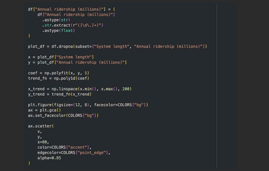 Трендовый анализ — выполнен путём аппроксимации данных линейной регрессионной моделью, что позволило выявить общую тенденцию изменения пассажиропотока при росте протяжённости сети.