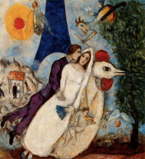 Мы видим момент их свадьбы. Казалось бы такой счастливый момент соединения двух любящих сердец, но атмосфера картины нам транслирует предчувствие чего-то нехорошего, мрачного. Мы считываем неполадку этого союза. Шагал мог бы изобразить возлюбленных во время поцелуя. Ведь поцелуй это стилизованная метафора физической любви и плодородия. В картине нет цвета, за исключением кровавого ангела. Нет цвета, значит нет жизни. Очень специфический выбор для темы любви. В картине нет обещание будущей яркой и «тёплой» жизни, есть обещание тяжёлой жизни.