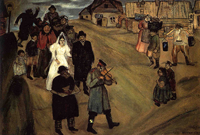 При первом взгляде можно не заметить маленького человека, который сидит на иссохшем дереве справа. Это маленький скрипач. Скорее всего старый скрипач. Для еврейского искусства это распространённый персонаж. «Если бы я не был евреем, как я это понимаю, я не был бы художником или был бы совсем другим художником», — писал он свою позицию в одном из эссе. Мнение о том, что все евреи играют на скрипке прочно укоренилось в обществе. «Скрипка всегда была еврейским инструментом, — убежден израильский скрипач Вадим Глузман. — Надеюсь, меня не сочтут шовинистом, но это факт: большинство величайших скрипачей были евреями. Я чувствую себя следующим звеном и ощущаю на своих плечах груз поколений». Это символ культурного наследия и еврейской традиции. Без этого не могла состояться семейная жизнь Марка и Беллы. Жизнь обоих вращалась вокруг религиозной еврейской жизни, обычаев, традиционных трапез и праздников еврейского календаря.
