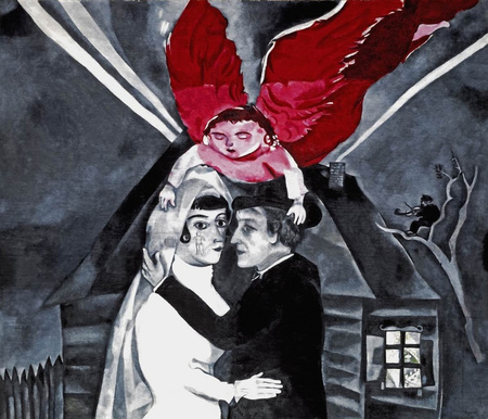 Маленький человечек, чьё изображение мы видим на щеке Беллы, это не просто случайное изображение. Это символ ребёнка, о котором может быть мечтала женщина, мысли о будущем ребёнке молодожёнов. Желание не просто женщины иметь ребёнка, а еврейской женщины. Белла была из большой семьи, она была 8 ребёнком в семье. Желание абсолютно понятное. Тем более она хотела ребёнка от любимого мужчины, которого ждала 6 лет. Уже через год у пары рождается дочка Ида. «Когда Белла ушла из жизни, 2 сентября 1944 года в шесть часов вечера, громыхнула грозовая буря и непрерывный дождь излился на землю. В глазах моих потемнело». [Марк Шагал: долгая жизнь и смерть в полёте] После такого нам легко представить историю о том, что любящий муж вскоре уходит за своей возлюбленной и единственной, не выдержав боли утраты. Однако его из этого состояния выводит дочка Ида. Может быть этот ангел является вестник доброй новости о приближающимся пополнении в семье?