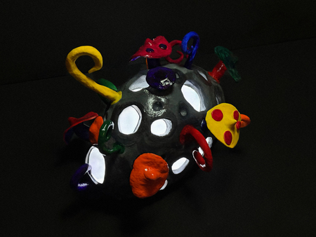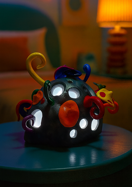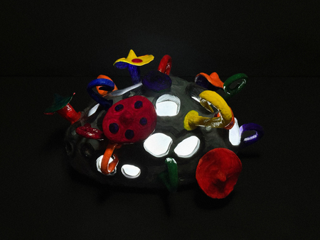 В основе ночника лежит пластмассовая форма, которая затем была задекорирована глиной, красками и глянцевым лаком. Внутреннее наполнение включает гнездо для батареек LR44, обеспечивающее питание, а также светодиоды, служащие источником света. Особенностью конструкции является выбор пластмассового каркаса: он обеспечивает мягкое рассеивание света, делая его не слишком ярким и комфортным.
