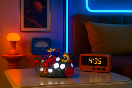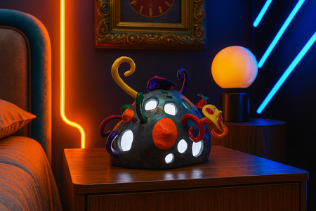 Ночник «Vortex» — это асимметричная, грубая скульптура, напоминающая отколовшийся осколок метеорита, который, кажется, был застигнут и трансформирован в вихре психоделической энергии прямо посреди своего стремительного полета над Землей.